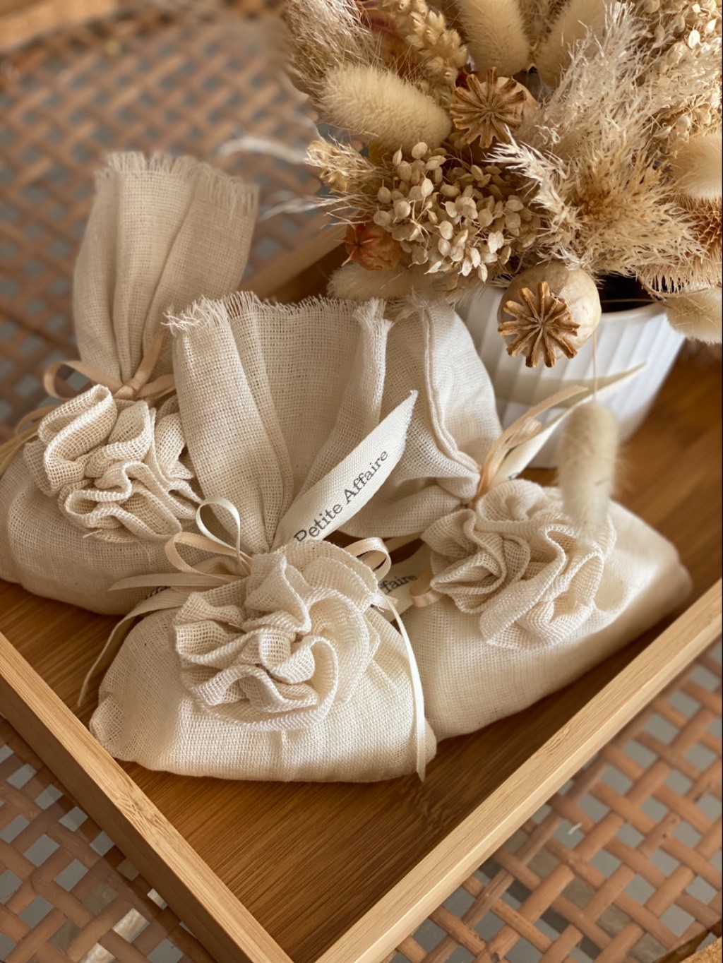 Esta delicada bolsa perfumada, esta confeccionada con gasa de algodon cruda, con detalles de flores hechas a mano y pastillas perfumadas con nuestra deliciosa fragancia Higo.