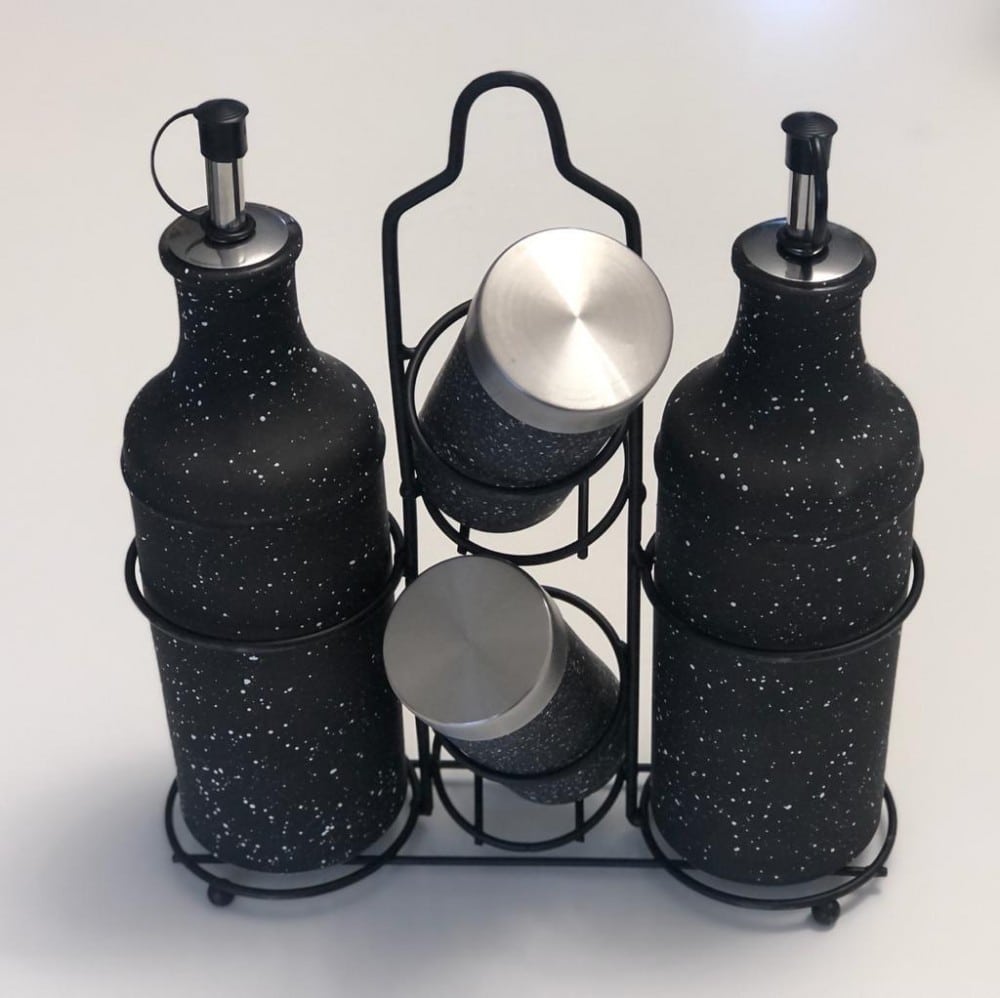 SOPORTE COLOR NEGRO, CON ACEITERO, VINAGRE, SAL Y PIMIENTA, DE VIDRIO, CON REVESTIMIENTO COLOR NEGRO CON DECORACION.