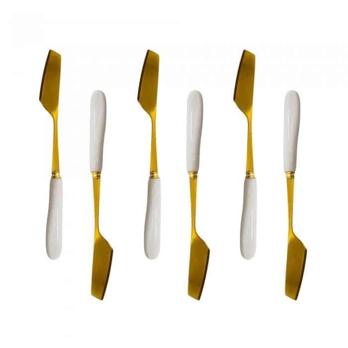 Hermoso y delicado set x6 de untadores Home Concept realizados en acero inoxidable y mango de porcelana. Lucí tus desayunos de la manera mas elegante y deleita a tus invitados con este diseño.