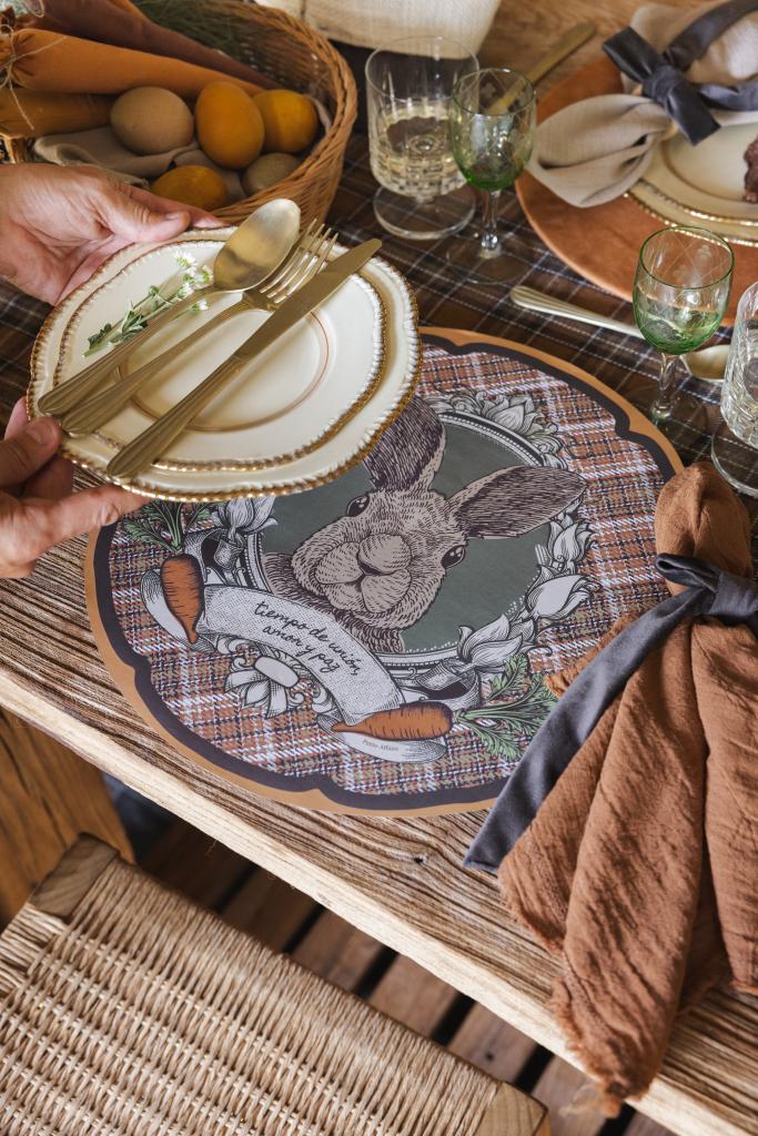 Pack papel para vestir la mesa en Pascua. Diseño exclusivo con ilustración central de conejo, flores y zanahorias, en una paleta cálida y otoñal que combina tonos tierra, verdes profundos y detalles clásicos. Ideal para sumar clima festivo sin perder elegancia.