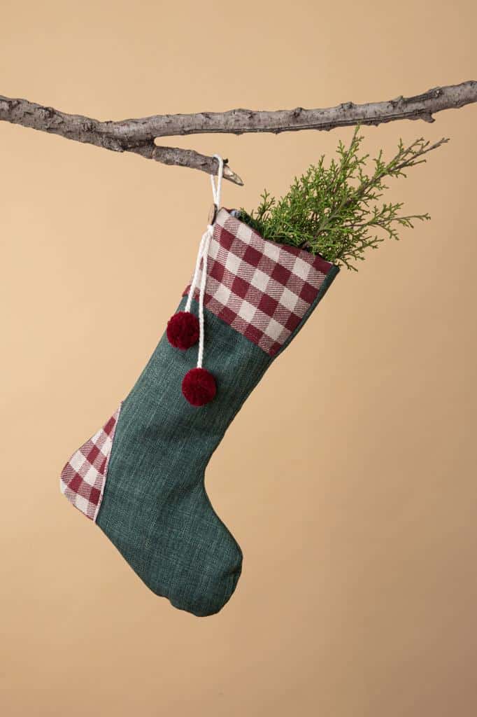 Bota decorativa Navideña confeccionada en tejido tramado verde inglés con detalle de botamanga en paño a cuadros bordó con colgante de cordón retorcido y terminaciones de pompones.
