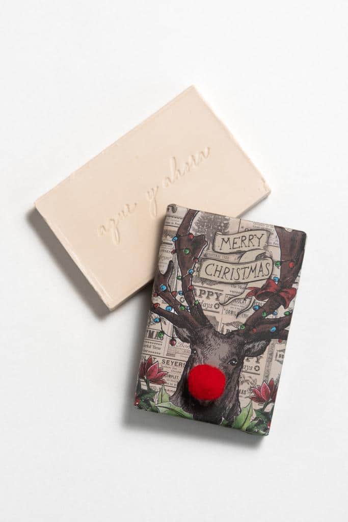 Jabón rectangular con mensaje en bajo relieve y presentación irresistible de nuestro reno con la clásica nariz de Rudolf, el reno más famoso de Santa.
