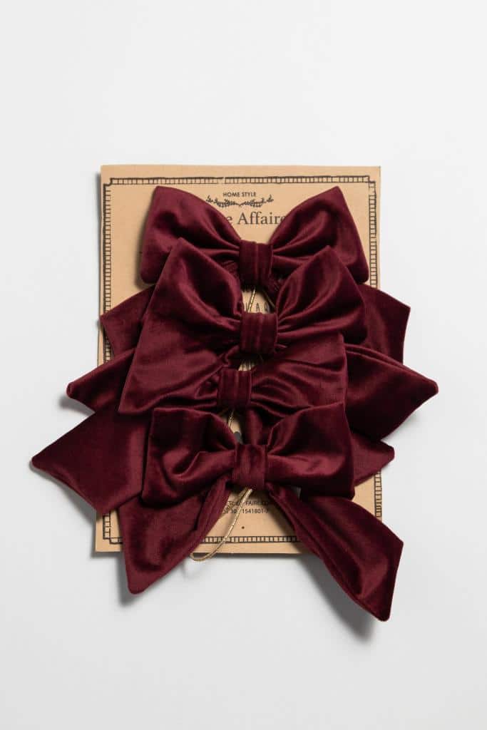 Servilletero Moños Set x4 confeccionado en velvet color higo. Estos complementos para la mesa suman mucho a la hora de vestir la mesa y transmitir el espíritu navideño.